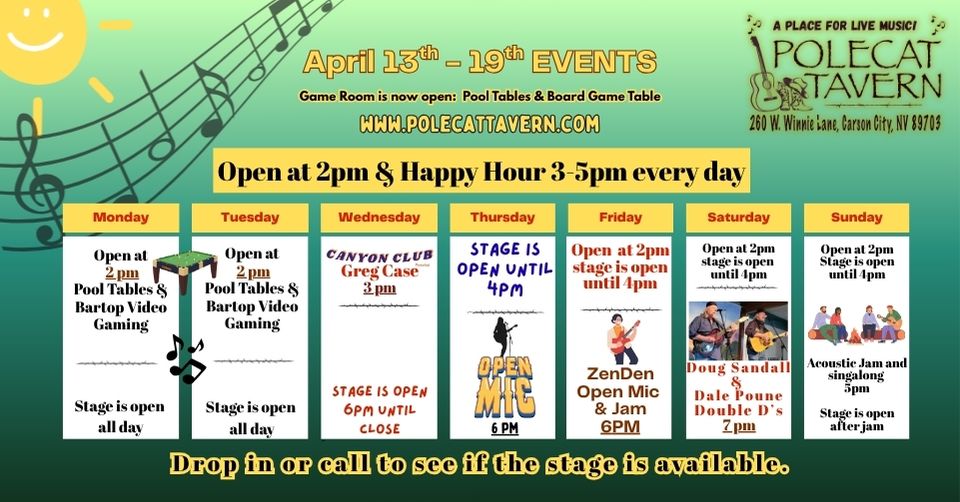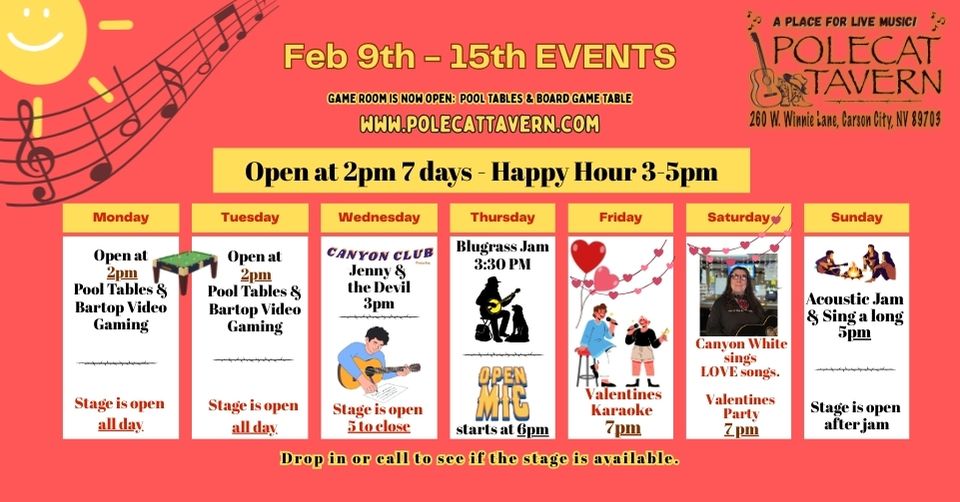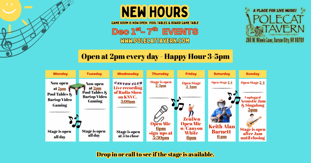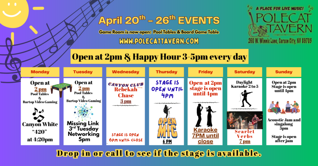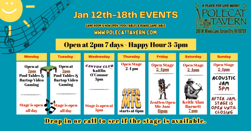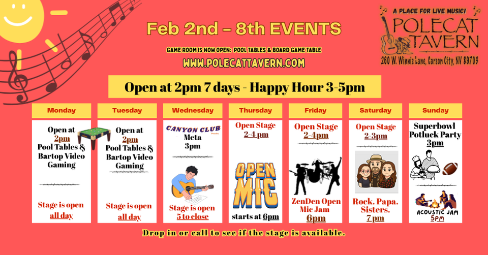 The address is 260 West Winnie Lane, Carson City, NV 89703. You can email us at polecattavern@gmail.com. Hope to see you soon!