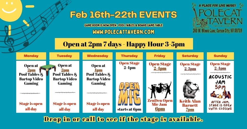 Welcome to Polecat Tavern – A Place for Live Music, and friends. We are comfortable, intimate, and friendly with a full bar and prepackaged snacks. You are welcome to order in if you’re hungry and we have Food Trucks drop by. We now have video Poker, Black Jack, and KENO casino video gaming at the bar.