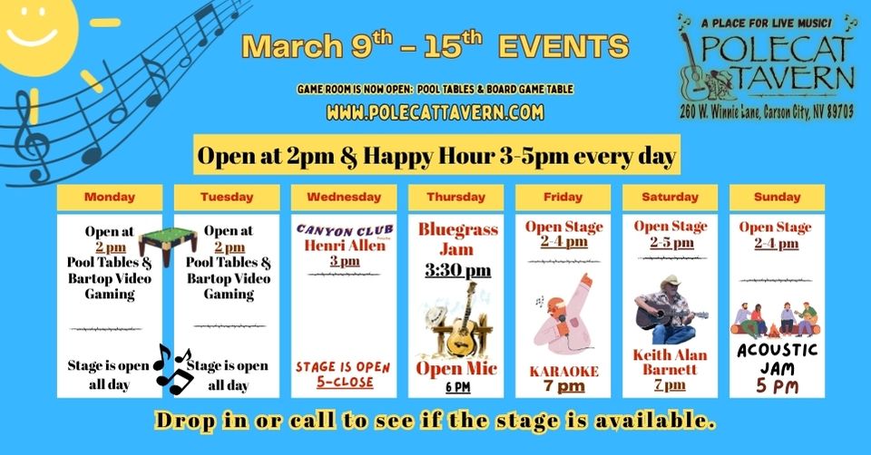 | Happy Hour & Casino Games | Sunday Acoustic JAM | Concert w/Catesby Jones |