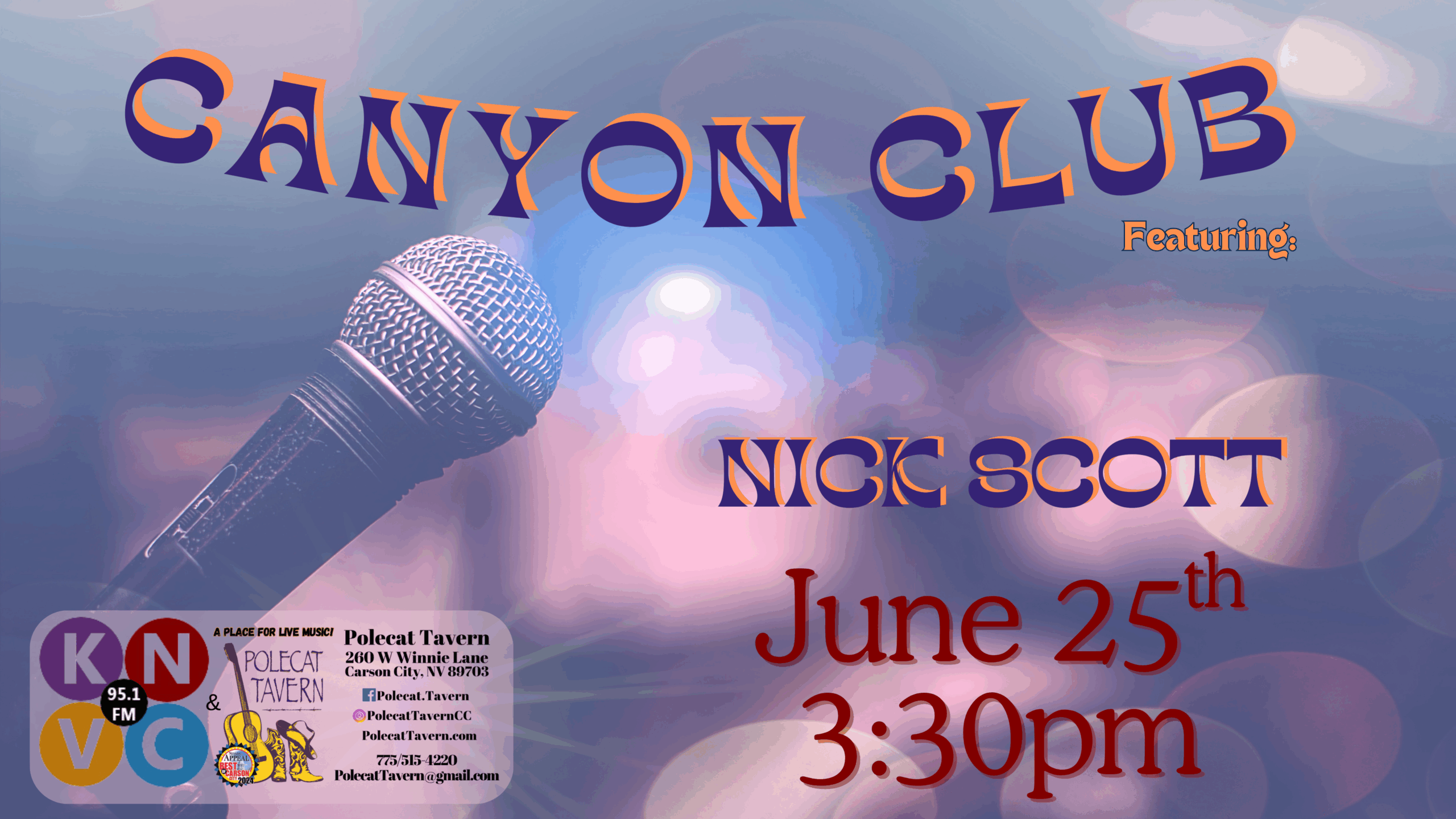 On Wednesday, June 25th Canyon Club will feature Nick Scott for an interview and to share tunes. Drop on in and check it out! Attendance is free. Show starts at 3:30. Doors open at 1pm.