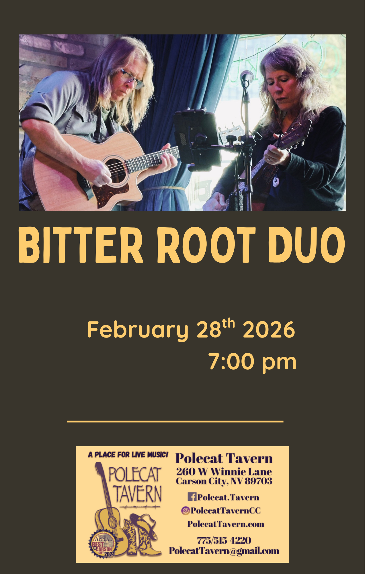 Bitter Root Duo is a husband-and-wife duo blending the soulful sounds of 70's forward music! You will love this music style. Polecat Tavern260 W Winnie LaneCarson City, NVOpen 7 days,. Happy Hour 3-5pm daily. https://polecattavern.com - Sign up for our … Continue reading → |